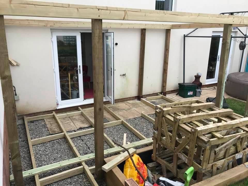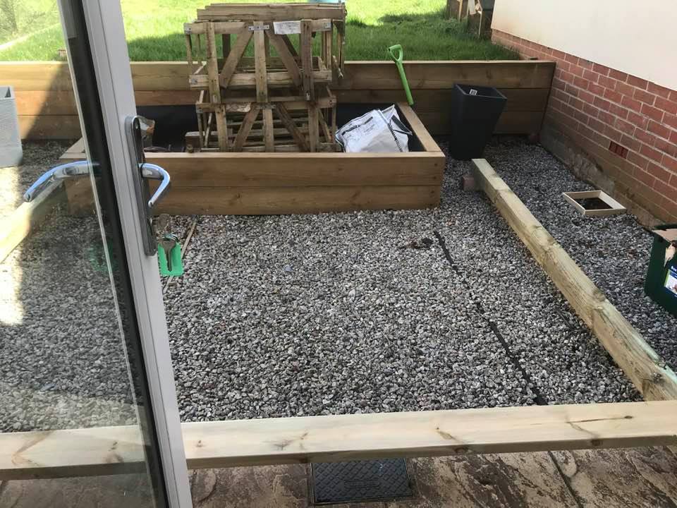 With collection of free gravel (twice) and some “postcrete” the batons under the decking were levelled, and quality controlled… thanks, Tash.