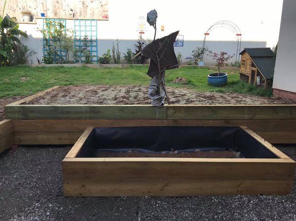 All dug out, sleepers installed, lawn levelled behind sleepers, grass seed down and makeshift scarecrow erected.